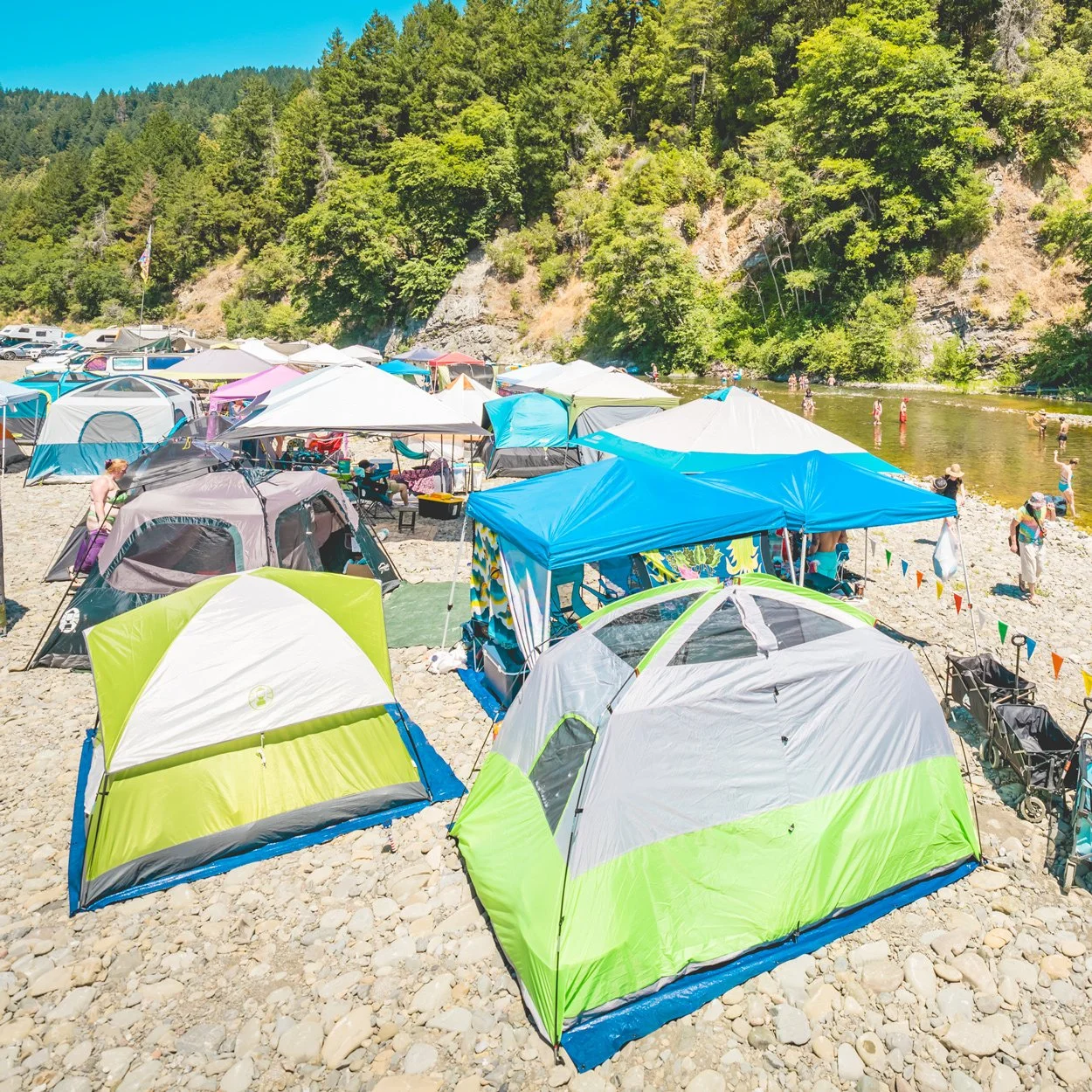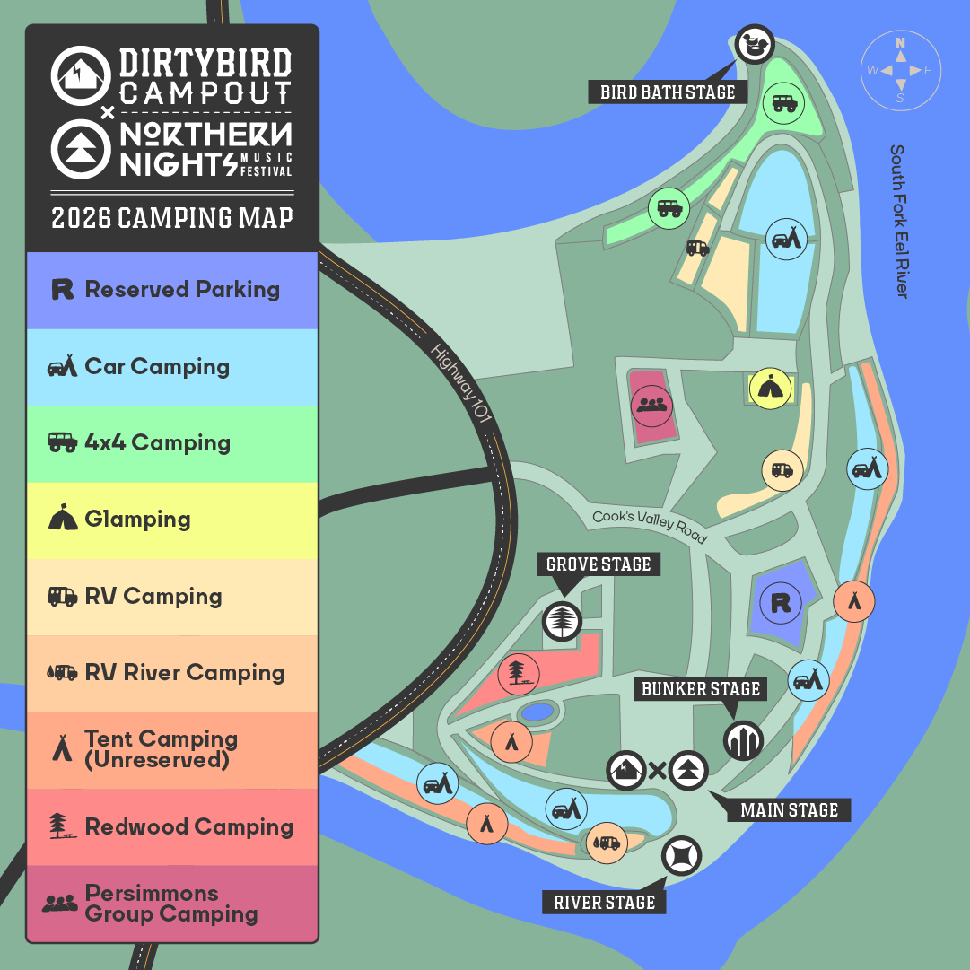 Free, unreserved tent camping is included with every admission ticket. Sleep steps from the Eel River and wake up surrounded by redwoods. Camping is set primarily along the river bar, offering open skies, natural beauty, and a short walk to the Main Stage. Space is mostly riverfront, with limited grassy meadow areas available. Arrive early to secure your preferred spot — campsites are first come, first served. Please respect the river and surrounding land: pack it in, pack it out, and leave no trace.